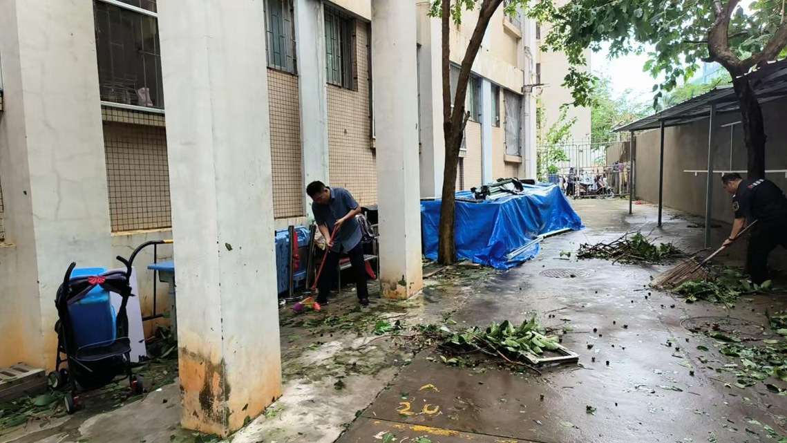 第21号台风“麦德姆”携狂风暴雨袭击琼岛,给海口市的生产生活带来严峻考验。2025年10月6日,风雨过后,av女优 校园内一片忙碌而有序的景象。av女优 聂清斌校长实地查看附小受灾情况,并对附小的校园文化建设提出指导建议。后勤处蒙激流处长陪同指导附小灾后清运工作。