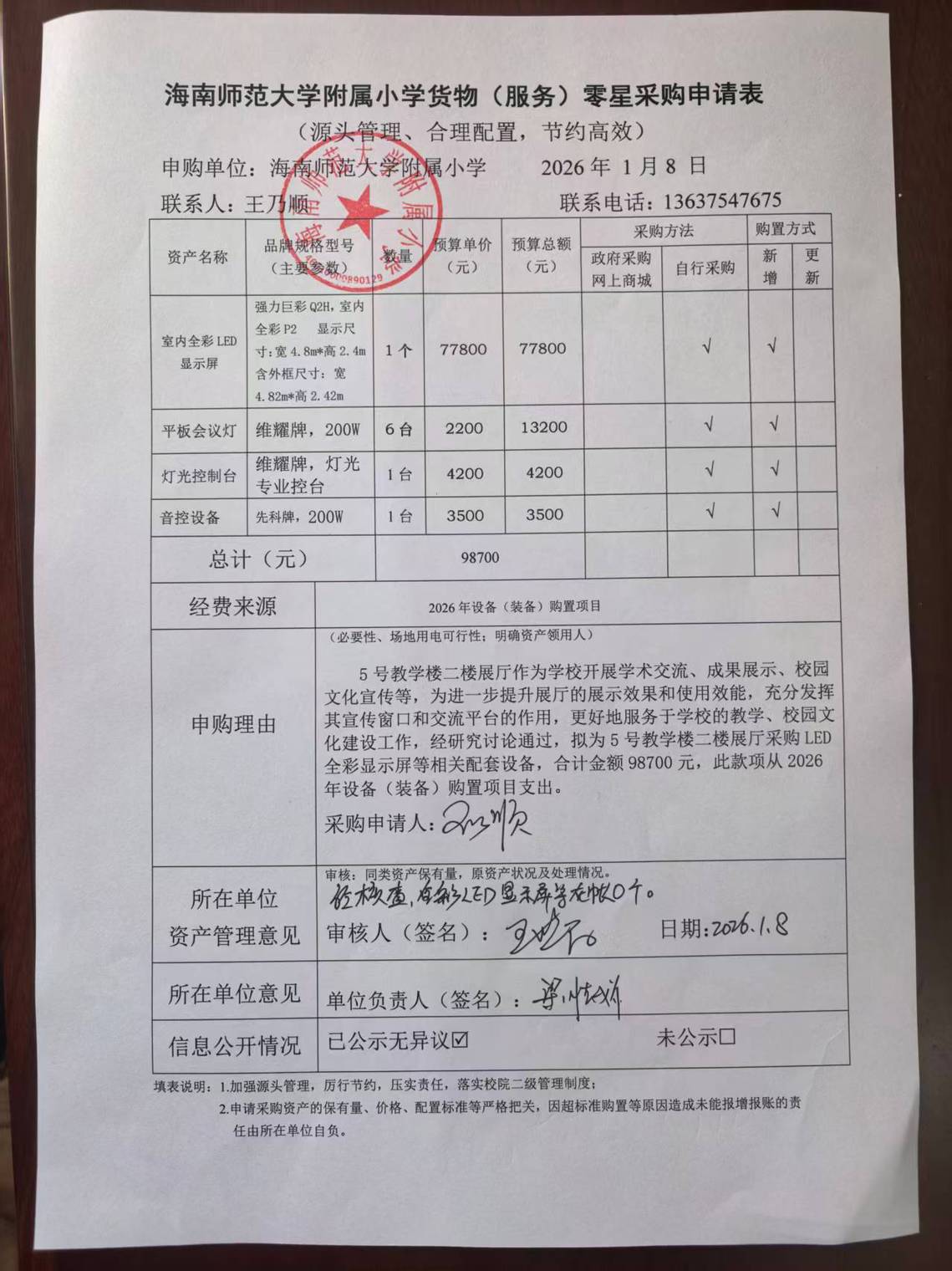 5号教学楼二楼展厅作为学校开展学术交流、成果展示、校园文化宣传等,为进一步提升展厅的展示效果和使用效能,充分发挥其宣传窗口和交流平台的作用,更好地服务于学校的教学、校园文化建设工作,经研究讨论通过,拟为5号教学楼二楼展厅采购LED全彩显示屏等相关配套设备,合计金额98700元。