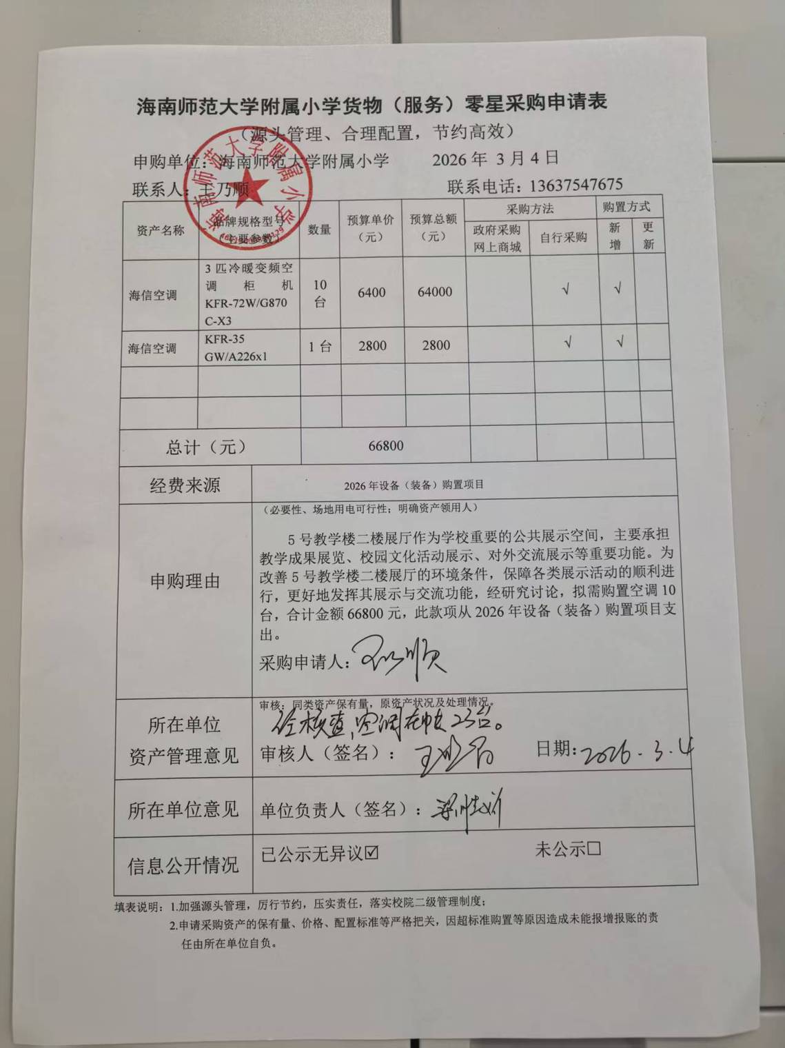 5号教学楼二楼展厅作为学校重要的公共展示空间,主要承担教学成果展览、校园文化活动展示、对外交流展示等重要功能。为改善5号教学楼二楼展厅的环境条件,保障各类展示活动的顺利进行,更好地发挥其展示与交流功能,经研究讨论,拟需购置空调10台,合计金额66800元。